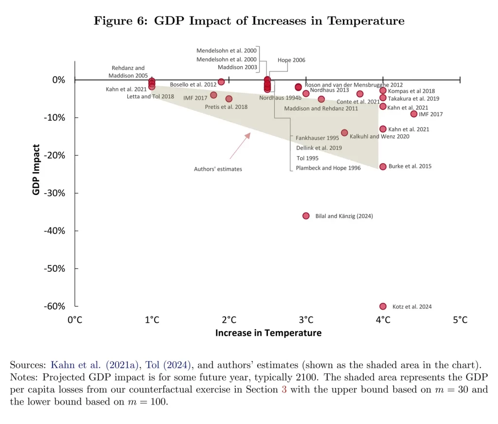Ce schéma montre comment la hausse des températures (en abscisse) impacte négativement les revenus mondiaux (en ordonnée). © Mohaddes et al., 2025, PLOS Climate, CC-by 4.0