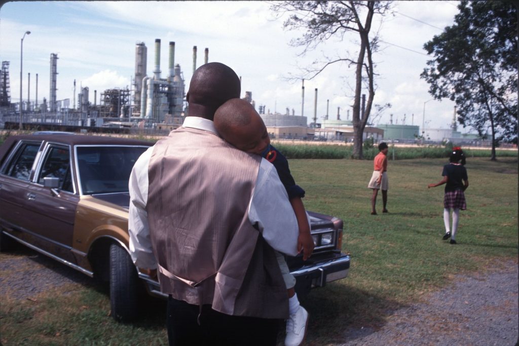 En 1998, une famille quitte une église entourée d’usines chimiques à Lions, en Louisiane. Les villes situées le long du fleuve Mississippi, près de Baton Rouge, sont connues pour être situées dans la Cancer Alley (« l’allée du cancer ») en raison des hauts taux de cancers enregistrés dans cette zone et de ses nombreuses usines chimiques et pétrochimiques. PHOTOGRAPHIE DE Andrew Lichtenstein, Corbis via Getty Images