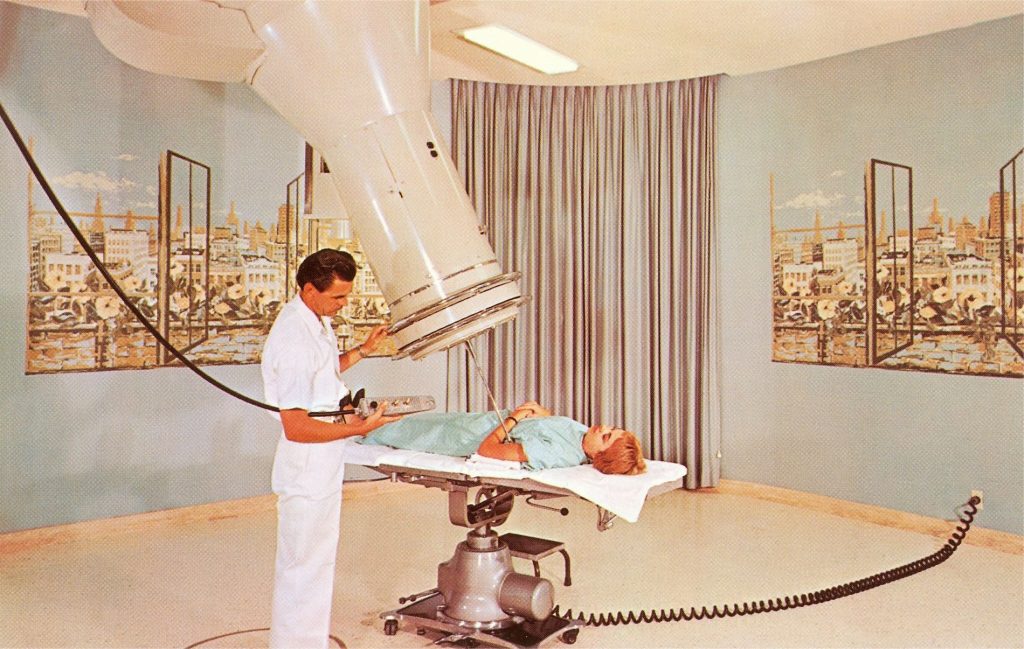 Un technicien en radiologie s’occupe d’une patiente dans une salle de radiothérapie dans les années 1960. Mise en pratique pour la première fois au début du 19e siècle, l’utilisation des rayons X pour détecter des maladies a évolué en d’autres technologies telles que la tomodensitométrie (TDM), l’imagerie par résonance magnétique (IRM) et les ultrasons, entre autres. PHOTOGRAPHIE DE CORBIS/GETTY IMAGES, Getty Images