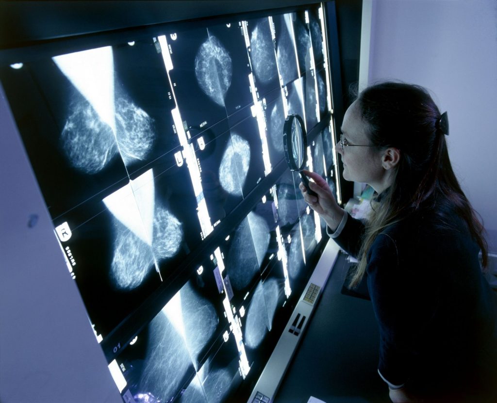 Une radiologue étudie un négatoscope sur lequel sont disposées des mammographies issues d’une base de données nationale au Royaume-Uni. Cette base de données a pour but d’uniformiser les radiographies afin de faciliter leur comparaison et de diagnostiquer plus rapidement tous types d’anomalies visibles sur les mammographies. PHOTOGRAPHIE DE James King-Holmes, Science Source