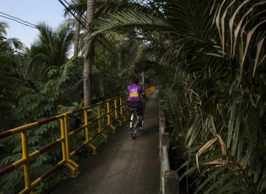 Au milieu de l'immensité urbaine de Bangkok, un petit coin résiste: là où le fleuve fait une boucle, cohabitent des centaines d'espèces de plantes et d'oiseaux et se croisent de nombreux vélos plus présents que les voitures.