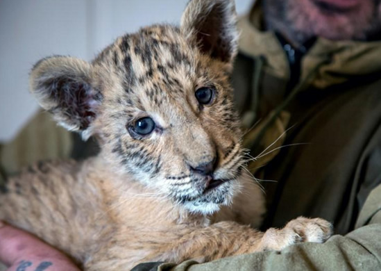 Tsar, un bébé ligre de deux mois et demi, croisement très rare entre un lion et une tigresse, dans les bras du soigneur d'un zoo itinérant dans la région de Rostov-sur-le-Don, dans le sud de la Russie / afp.com - Yuri MALTSEV
