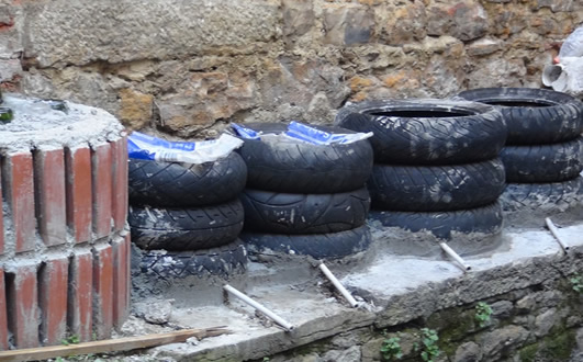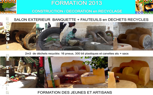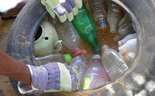 Il est en effet parti d’un constat simple, basé sur une technique déjà utilisée : on utilise des pneus remplis de terrepour faire des murs, et remplis de gravier sans béton pour les fondations de maisons. Il faut savoir qu’un seul pneu rempli au maximum peut supporter près de 72 tonnes (test IUT Grenoble 2012), assez pour faire un building ! En constatant la quantité de déchets jonchant les sols de nos villes et campagnes africaines, il a donc eu l’idée de remplir les pneus avec des déchets : solution 2 en 1, construction et recyclage. C’est par ailleurs une méthode peu coûteuse. Par exemple, un banc de 8 places demande8 pneus, un demi sac de ciment, un peu de grillage et des déchets plastiques ramassés autour de chez soi. Le tout recycle près de 0,4 m3 de déchets et ne bougera plus pendant au moins 20 ans.