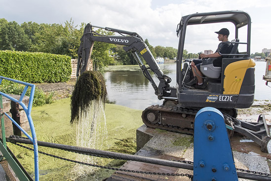 Les algues vertes se sont mises à proliférer dans la Loire, bloquant ici l’écluse du port de Roanne. En cause : l’agriculture intensive, responsable de la présence dans l’eau de quantités excessives de nitrate. © Pierre GLEIZES/REA