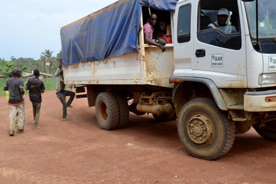 Des travailleurs de la plantation d'hévéas, qui appartient au géant singapourien Olam, montent dans un camion à la fin de leur journée à Batouri, dans le nord du Gabon, le 30 avril 2015