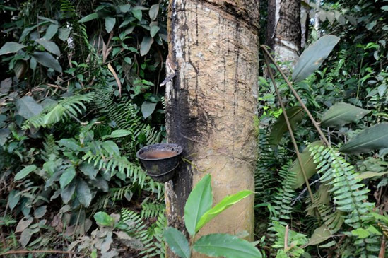 Dans la forêt autour de la plantation de Batouri, les villageois cultivent manioc, banane, tubercules et cacao tout en "saignant" d'innombrables hévéas sauvages. De petites coupelles sont attachées au bas des arbres, dont les écorces sont entaillées pour faire couler le latex.