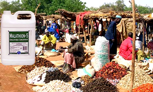 Vous avez certainement déjà vu des étalages recouverts d’une fumée blanche par leurs propriétaires, expliquant que c’est une poudre inoffensive faisant fuir les mouches et autres insectes dérangeant sur les marchés. Ce que vous ne savez pas, et ce que beaucoup de vendeurs ignorent, est que ce fameux produit, le malathion, est très dangereux pour la santé humaine, animale et environnementale.