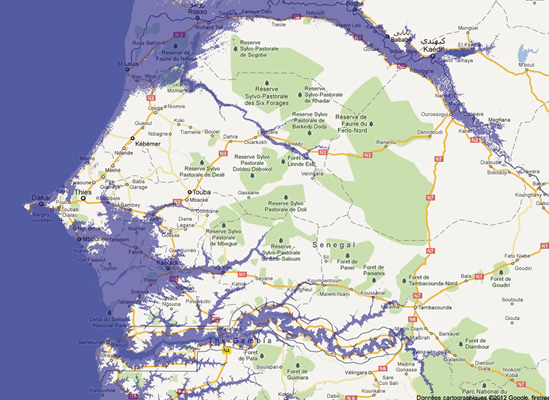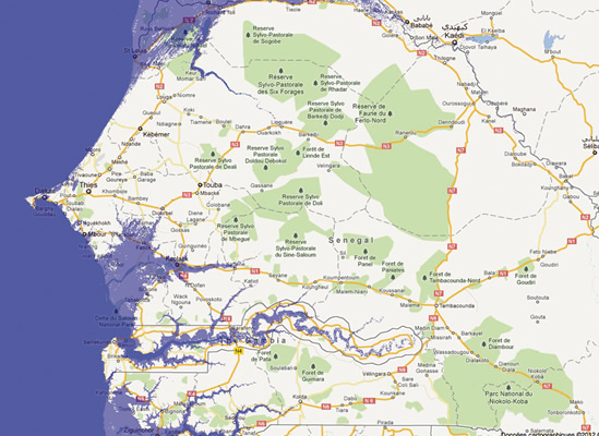 Au Sénégal, pour une élévation d’une hauteur de 20 mètres, la simulation représentée sur la figure 1 montre que la presqu’île du Cap vert sera pratiquement sous les eaux. Toute la grande côte et la petite côte seront sous les eaux avec la perte de la réserve de Faune de Ndiack, le parc de Djoudj, le parc National de Diawling, les villes de Rosso, Podor, Dagana, Richard Toll . Sur la petite côte, Joal Fadiouth, Djofor, Fatick, Niakhar, Kaolack, le Delta du Saloum, etc. disparaitront. Dans le Sud, le parc National de Varela, les villes d’oussouye, Kafountine, Ziguinchor, etc. seront rayés de la carte !