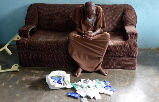 Ce résident du Djibi, un village près d'Abidjan, Siaka Coulibaly, photographié chez lui le 16 avril 2015, a développé plusieurs problèmes de santé et devenu aveugle à la suite du déversement des déchets toxiques du vraquier Probo Koala en 2006
