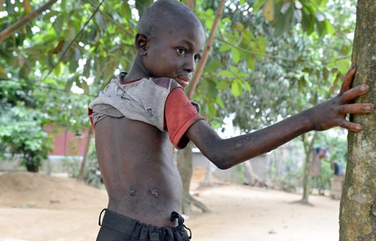 Le jeune Salem, photographié le 16 avril 2015 à Djibi, près d'Abidjan, subit toujours des séquelles du déversement de déchets toxiques du Probo Koala en 2006