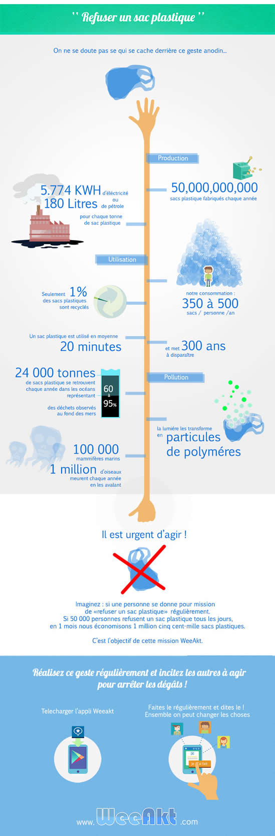 Lorsqu'un vendeur ou un caissier propose un sac plastique, il est préférable de le refuser. On peut également expliquer le motif de votre refus en une phrase : les sacs plastiques sont très polluants pour l'environnement, ils dégradent nos paysages, tuent les animaux qui les mangent, consomment des ressources naturelles comme le pétrole et ne sont pas dégradables !