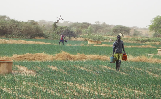 Champs d’oignons alimentés en eau grâce à des puits dans le village côtier de Potou, grand centre maraîcher de la région de Louga, à l’ouest du Sénégal.
