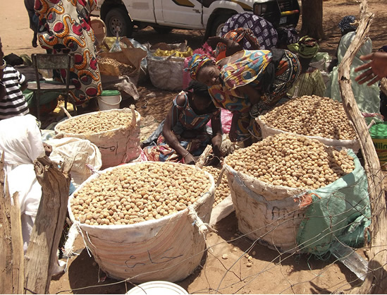 Commerce de fruits de « Balanites aegyptiaca », ou dattier du désert, au marché local de Widou au Sénégal.