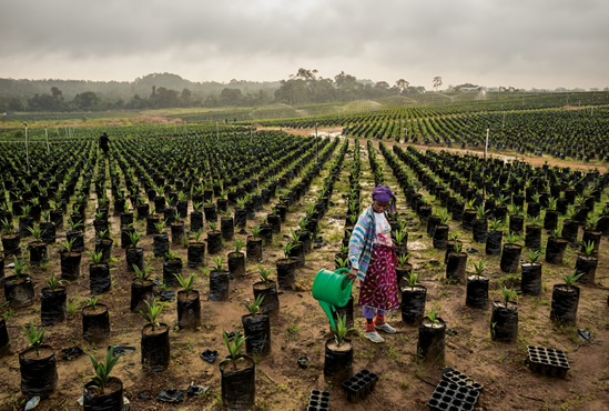 Au Liberia, une employée arrose des jeunes plants de palmiers à huile. Les responsables gouvernementaux espèrent que les 35 000 emplois promis par Sime Darby, le géant malaisien de l’huile de palme, permettront d’apaiser les tensions dans un pays ravagé par la guerre. © Robin Hammond