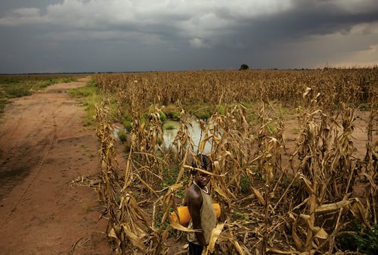 En Éthiopie, Ajiem Ogalla, 11 ans, glane de l’awieo, un arbuste comestible, au milieu d’un champ de maïs planté par la société indienne Karuturi Global. Après avoir déplacé des villageois et abattu des forêts primaires, l’entreprise est au bord de la faillite. © Robin Hammond